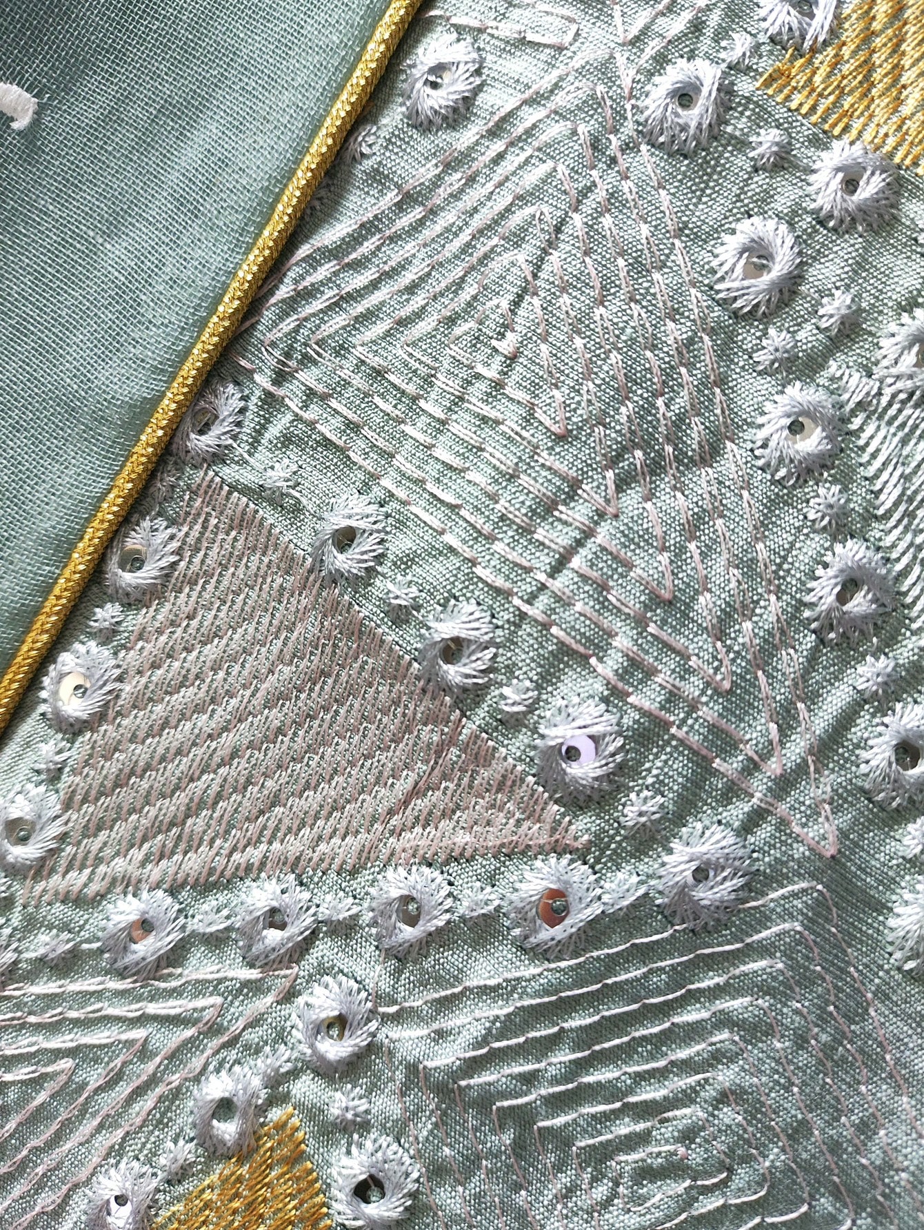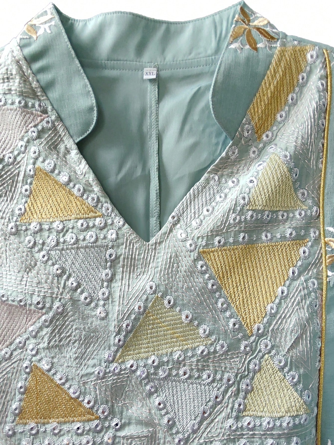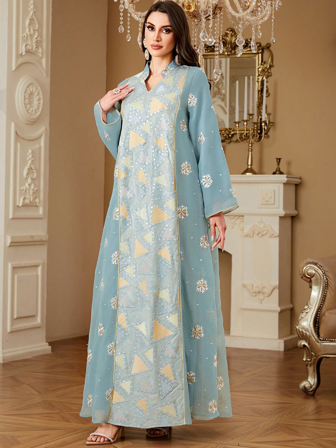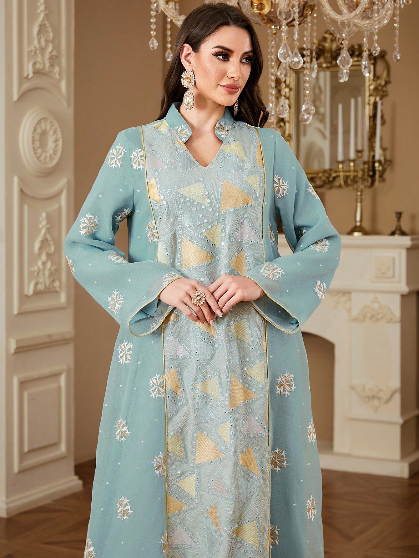 فستان طويل أخضر محتشم مطرز بنمط هندسي - مثالي للسهرات الرسمية والأعياد